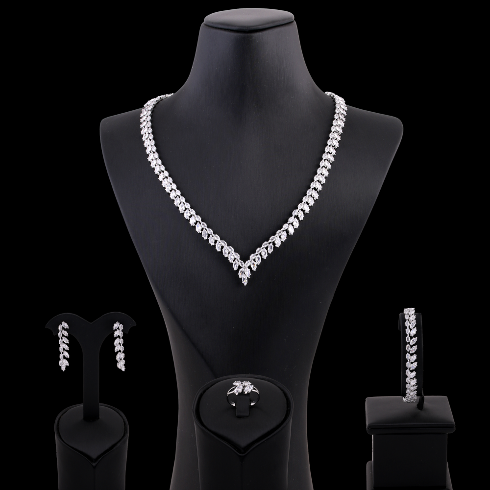 نقدم لكم مجموعة مجوهرات جاسمن طقم Zircon عبارة عن مجموعة مكونة من أربع قطع من المجوهرات ( عقد - أقراط - خاتم - اسوارة ) بتصميم أنيق يتناسب مع جمالك
