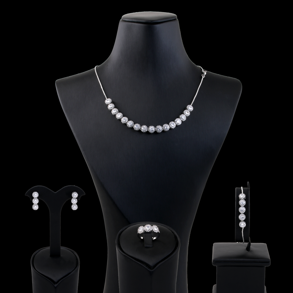 نقدم لكم مجموعة مجوهرات زركون سويسري طقم Zircon عبارة عن مجموعة مكونة من أربع قطع من المجوهرات ( عقد - أقراط - خاتم - اسوارة ) بتصميم أنيق يتناسب مع جمالك