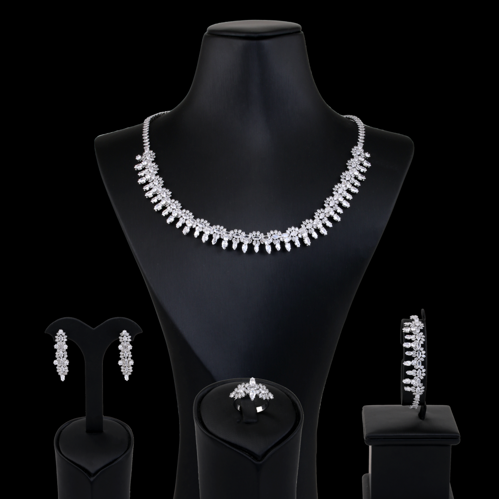 نقدم لكم مجموعة مجوهرات كوارتز طقم Zircon عبارة عن مجموعة مكونة من أربع قطع من المجوهرات ( عقد - أقراط - خاتم - اسوارة ) بتصميم أنيق يتناسب مع جمالك
